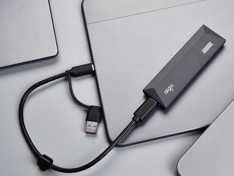 aigo移动固态硬盘S10搭载USB3.2 Gen2 Type-C接口,读写速度最高可达1000MB/s,GB级别数据秒间传输,无需漫长等待。内部采用全段容量高品质TLC芯片,速度快、稳定性高,而且不发烫,让数据存储更加安全可靠。