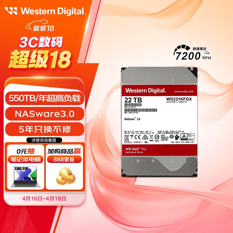 西部数据 WD221KFGX NAS机械硬盘 WD Red Pro西数红盘 22TB 企业级7200转512MB SATA CMR垂直网络存储3.5英寸