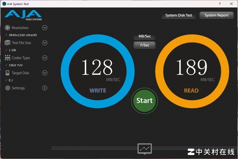 AJA System test这款测试软件更偏重视频的连续录制性能,设定为3840x2160 10bit YUV格式,文件大小1GB,测得读写速度达到了189MB/s和128MB/s,实录性能远超V30的规范。