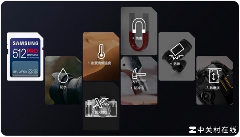 作为一款专业级存储卡,PRO Ultimate SD存储卡同样提供了防水、防磁、防X射线、防跌落、抗冲击、防磨损、耐高低温7大防护,近乎覆盖了所有恶劣环境。