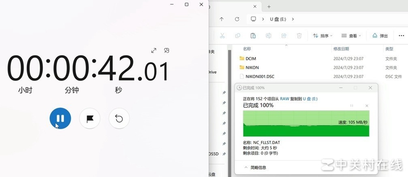 最后测试三星PRO Ultimate SD卡128GB在电脑上的文件读写性能,我们将152张共计4.4GB的RAW原片复制其中,用时42.01秒,写入速度基本在105MB/s左右,整体表现比较平稳。