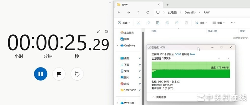 再将这些RAW原片复制到电脑的硬盘中,用时仅为25.29秒,读取速基本在179MB/s,读取曲线非常平直。总体看,这张存储卡连续读写性能非常稳定,没有出现因连续读写而掉速的情况,在连续高负荷工作状态也能保证性能平稳释放。