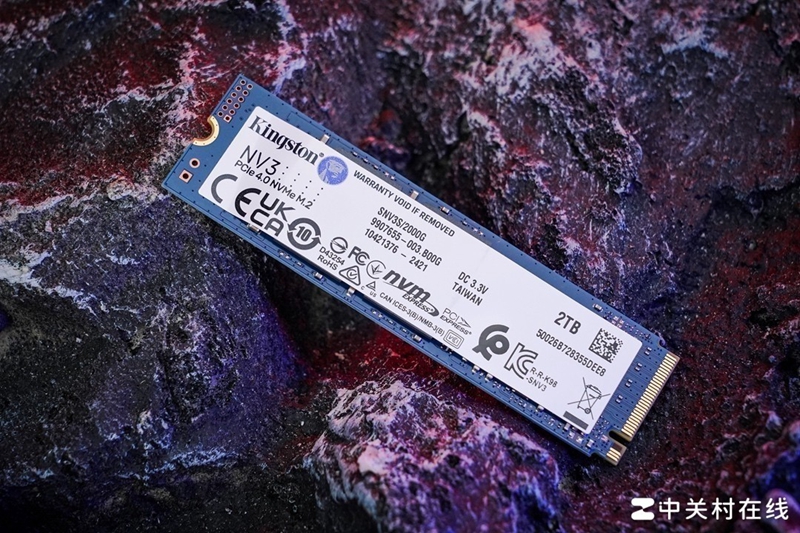 金士顿 NV3依然采用深蓝色的PCB和M.2 2280长度规格,正面的白色标签标注了产品的型号、容量、金士顿镭射防伪标识、SN编码以及各种认证标识。