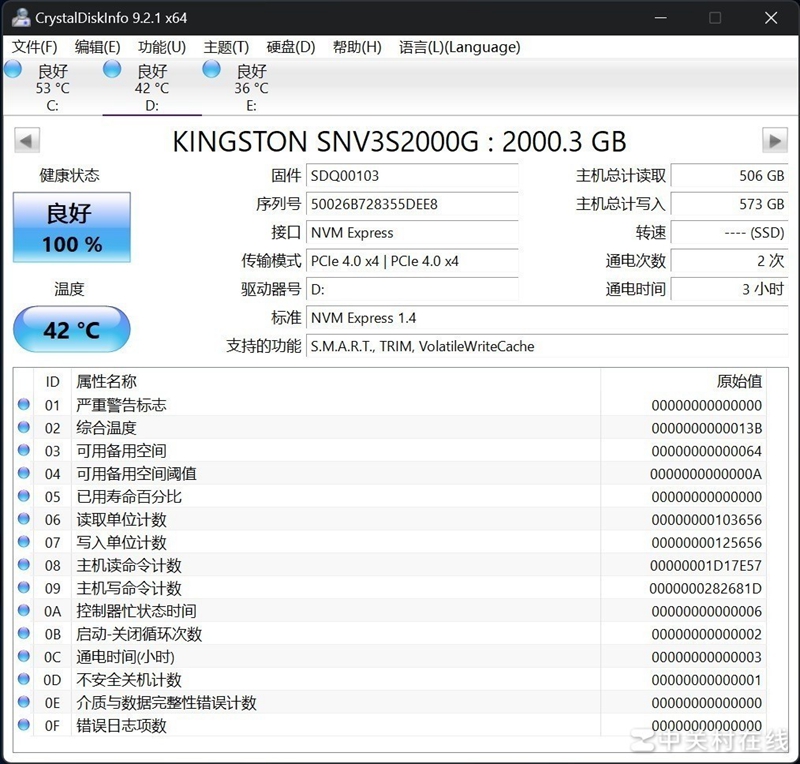 通过Crystal Disk Info的信息,可知金士顿 NV3 2TB的标称容量为2000.3GB,采用PCIe4.0x4传输模式,支持NVMe1.4标准,26℃室温下待机温度仅为42℃。