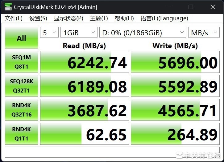 Crystal Disk Mark是存储设备最常用的基准测试软件,通过负载、队列深度和线程直观的展示了固态硬盘的性能。经测试,金士顿 NV3 2TB最高连续读写速度为6242.74MB/s和5696MB/s,均超出6000MB/s和5000MB/s的标称值,相对于上代产品NV2性能提升幅度近乎一倍,而随机读写性能分别达到972K IOPS和1169K IOPS。
