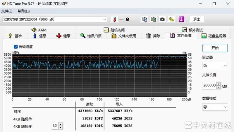 众所周知,SLC缓存是消费存储行业的常用做法,简单来说就是在固态存储的闲置空间划出一部分空间,通过模拟SLC的方式来提升TLC和QLC闪存的性能,因此SLC缓存的容量大小直接决定固态硬盘能全速保存多大的数据。在HD Tune Pro中,我们向金士顿 NV3 2TB中写入200GB的数据,写入曲线全程基本在5300MB/s小幅平稳波动,没有出现降速的情况。