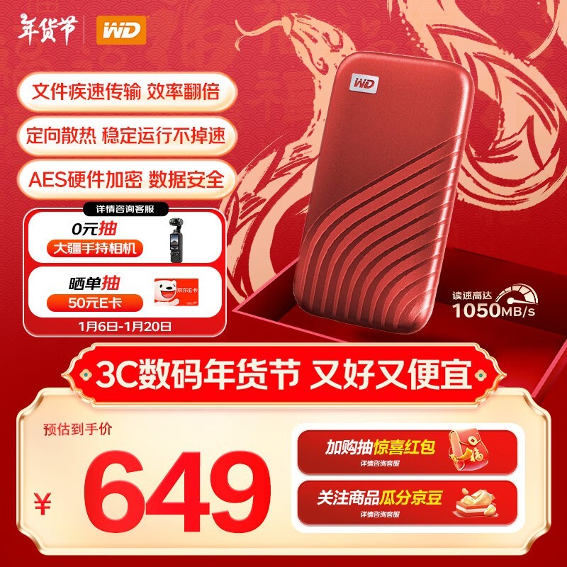 现在购买西部数据 My Passport 1TB高速Type-C固态移动硬盘,满69减10元优惠券等你来拿!折后每件只要639元。一款轻巧便携的西部数据 My Passport,小巧机身便于携带;全金属材质打造,耐用且抗冲击力强;USB 3.2 Gen 2传输速度高达1050MB/s读取和1000MB/s写入;支持256位AES加密,兼容Windows和Mac设备;五年质保与您一同见证品质。