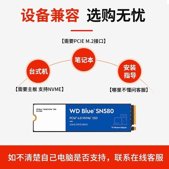 西部数据 SN580 SSD固态硬盘 m.2接口nvme协议 PCIe4.0 蓝盘高速游戏办公 标配 2TB(WDS200T3B0E)