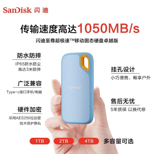 闪迪 E61 1TB Nvme移动固态硬盘(PSSD)至尊极速卓越版海天蓝SSD 读速1050MB/s 手机笔记本外接