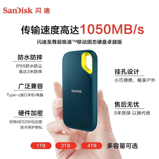 此外,闪迪 E61移动固态硬盘还具有坚固耐用的特点,设计坚固耐用,能承受2M坠落高度,具有IP55级防水防尘性能。无论是在办公室还是在户外使用,都不用担心意外损坏。这款移动固态硬盘的超强性能和优异的耐久性将为您带来全新的存储体验。