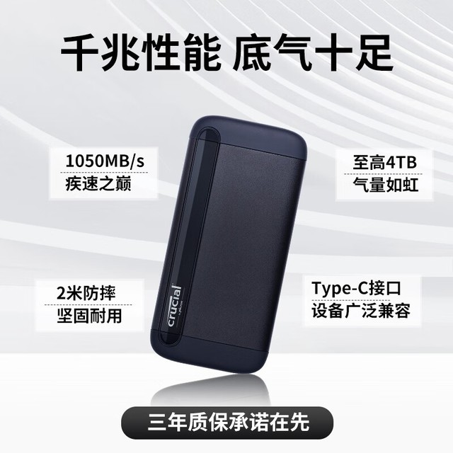 Crucial 英睿达 X8系列移动固态硬盘,大容量存储解决方案。这款硬盘容量达到了4TB,可以满足用户对于数据存储的需求。同时,其传输速度高达1050MB/s,让数据传输更加迅速。并且,它具有2米的防摔性能,可以有效保护数据安全。