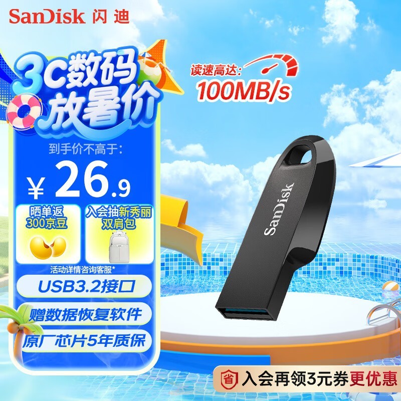 闪迪 CZ550 U盘在微信小程序购物车下单,京东活动售价26.9元。可参与满30减5元、满20减5元优惠活动,PLUS会员有立减,还有首购礼金3元,晒单返300京豆。下单1件再凑单1件原价26.9元的商品后,主商品返豆后单件实付低至8.51元。